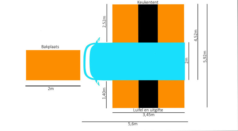 Afmetingen: 5,6 meter lang, 3 meter breed (incl. geopend uitgifteluik)