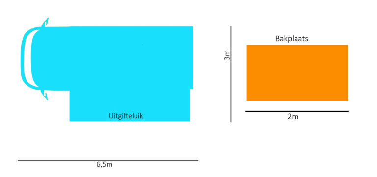 Afmetingen: 6,5 meter lang, 3 meter breed (incl. geopend uitgifteluik)